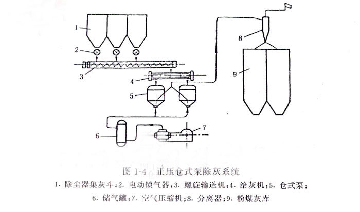 圖1—4是常用的正壓倉式泵除灰系統(tǒng),在此系統(tǒng)中,從干式除塵器分離下的灰,經(jīng)電動鎖氣器、螺旋輸送機和給灰機進(jìn)入倉式泵、用壓縮空氣將灰吹送。