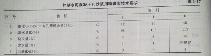 (1)拌制水泥混凝土和砂漿時,作拌和料的粉煤灰成品應(yīng)滿足表1—17的要求。